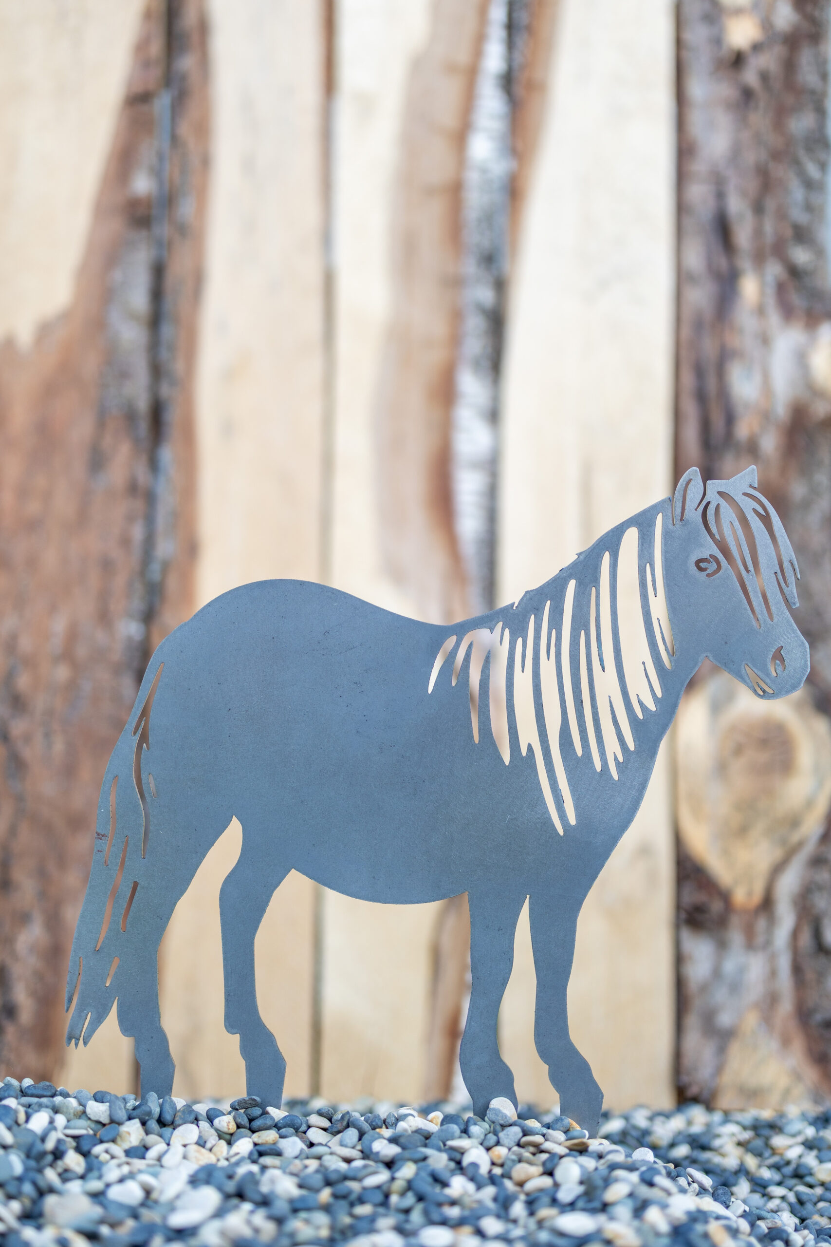 aus 3mm Stahl, wird unverrostet geliefert, Stahl rostet dann natürlich nach und nach, detailreiche und sauber gearbeitete Kontur, Made in Germany, Motiv Maße ca.: HxB 27,5x31,5cm, 4 Keile an den Hufen zum Stecken, je ca. 9cm