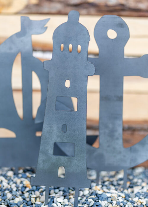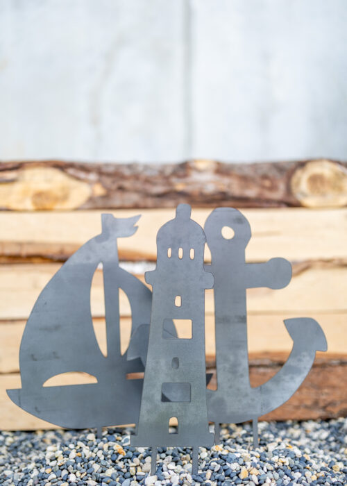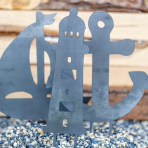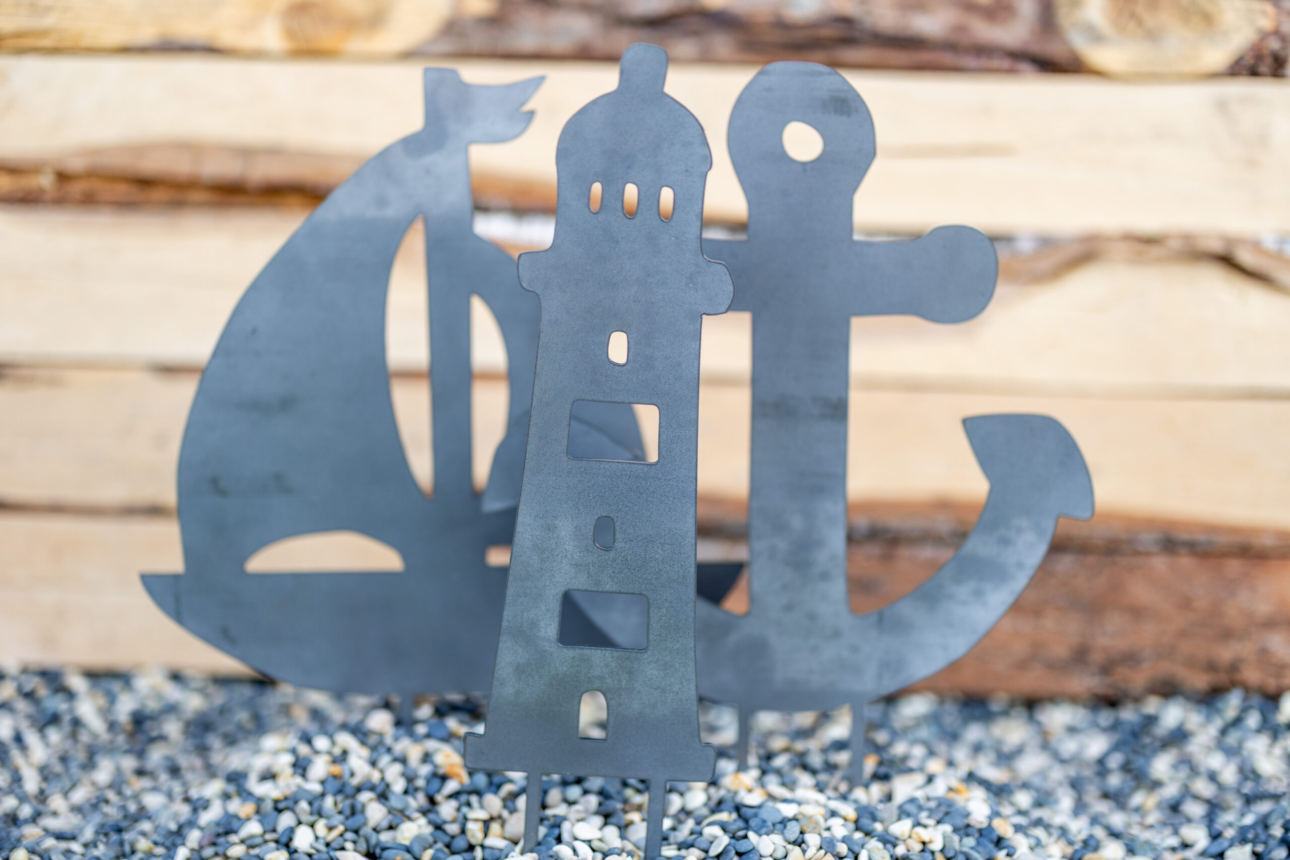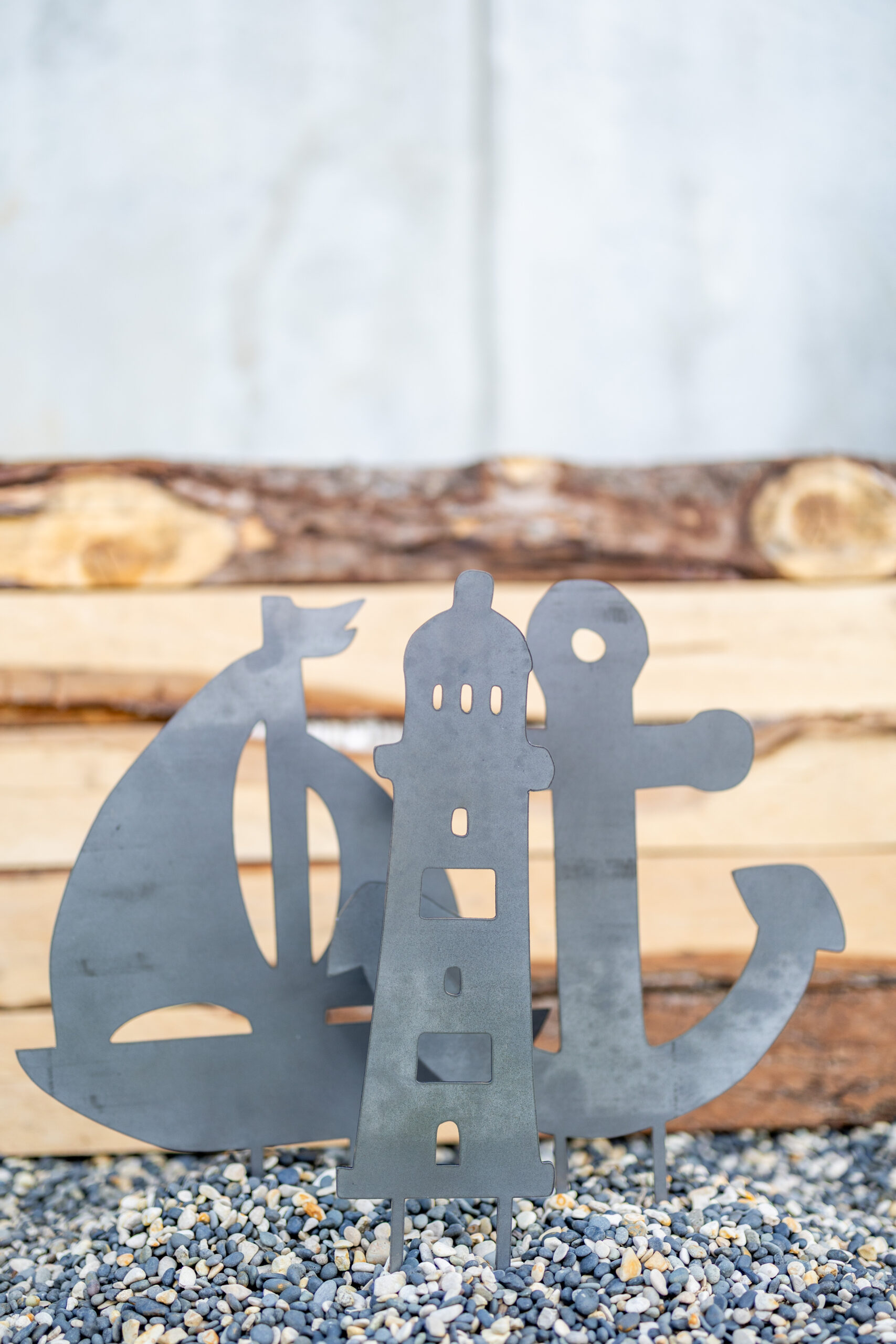 Set 3teilig aus 3mm Stahl, wird unverrostet geliefert, Stahl rostet dann natürlich nach und nach, Detailreiche und sauber gearbeitete Kontur, Made in Germany, Motiv Maße ca.: HxB Anker: 32x30cm, Leuchtturm: 34x12cm und Segelboot: 32x31cm, je 2 Stäbe zum Stecken je ca. 10cm